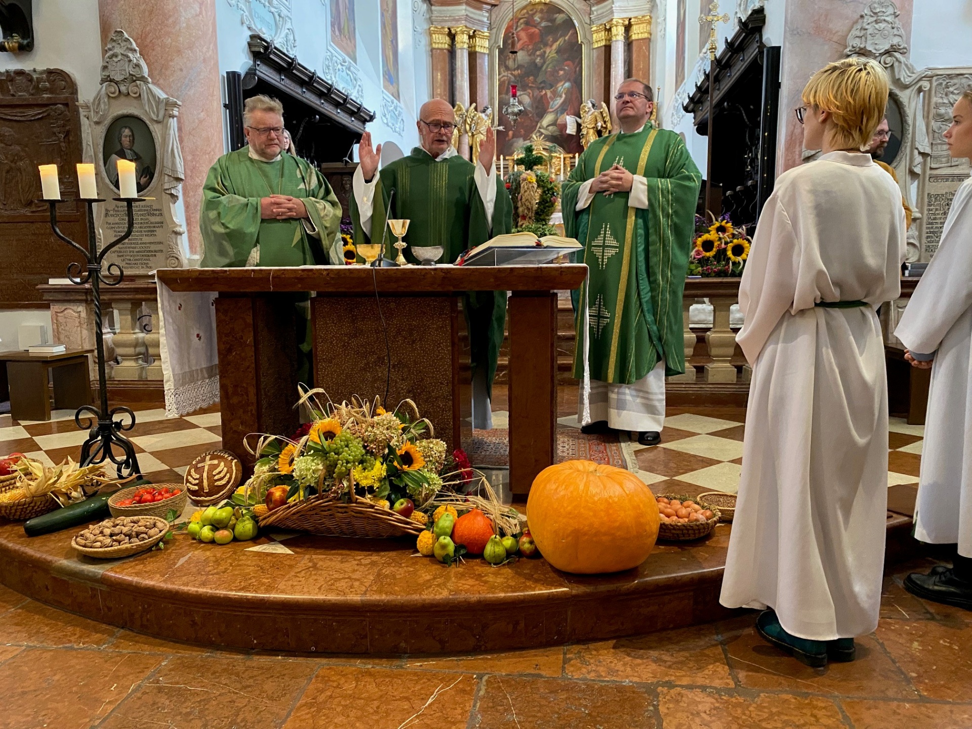 Ein Tag voller Highlights liegt hinter der Pfarre Mattsee, wurden doch am 28.9. gleich drei Feste auf einmal gefeiert. Den Anfang machte die Installierung von Pfarrprovisor Mag. Alois Ramsauer als Pfarrer, wegen der Dechant Dr. Ladislav Kučkovský extra aus Straßwalchen anreiste und dem Gottesdienst vorstand. Nach der feierlichen Zusage, dass er bereit sei die Verantwortung für die Pfarre zu übernehmen, versprachen dem "neuen" Pfarrer auch die Pfarrgemeinderäte gemeinsam mit ihm für das Wohl der Pfarre Mattsee zu sorgen. Doch damit nicht genug: Erntedank sollte bei dem Gottesdienst ebenfalls gefeiert werden, und so brachte die Landjugend neben der Erntekrone auch noch viele Gaben zum Altar und dankte nicht nur für eine reichliche Ernte, sondern auch für die geleistete Arbeit und den Schutz vor jeglichem Unwetter. Dabei durfte eine Prozession durch den Ort als krönender Abschluss der Messe natürlich nicht fehlen. Gemeinsam zogen die Vereine mit den Geistlichen und der Erntekrone durch den Ort, musikalisch begleitet von der Trachtenmusikkapelle und dem Diabellichor, die auch gemeinsam den Gottesdienst untermalt hatten.